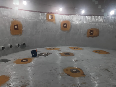 The first protective layer was applied to the tank base, followed by the vertical walls up to the first strake, ensuring full coverage and consistent thickness throughout.